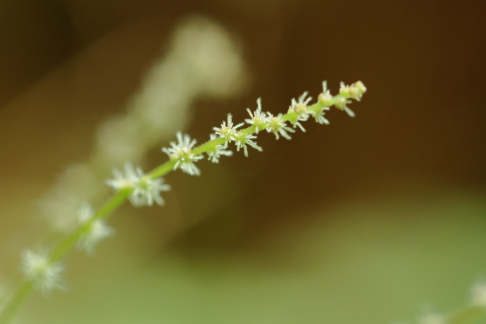 茎の上部の葉腋から穂状の雌花序が伸びています。茎の上部に雌花序、下部に雄花序をつけますが、個体には2倍体と3倍体があり、3倍体では通常、雄花序を形成しません。