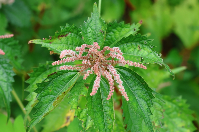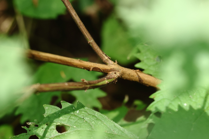茎の上部から赤い雌花序を出すコアカソを見つけました。茎は木質化しています。花の色は白やピンクのほか、こちらのように赤みを帯びたものまで多様です。
