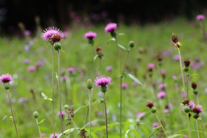 日当たりの良い斜面で、多数のノハラアザミが群生しています。紅紫色の頭花が一面に広がり、目を引きます。野原に群生する傾向があり、「ノハラ」の名が冠されています。