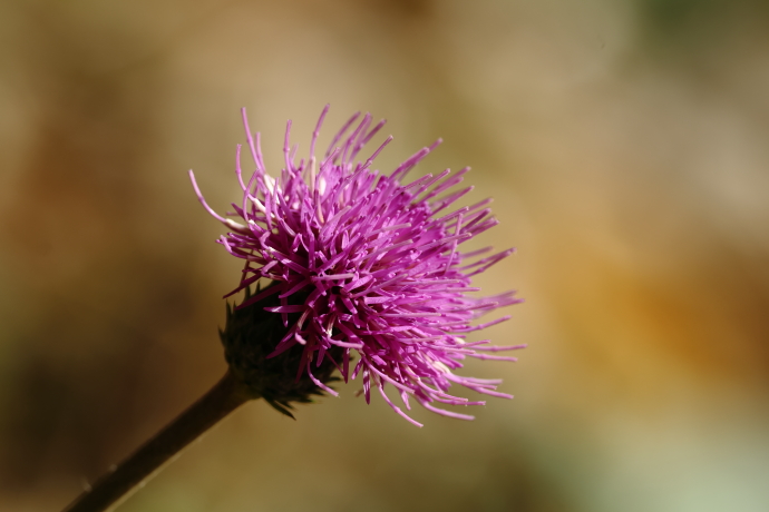 本種の品種クルマアザミを見つけました。頭花の下に葉のような総苞片が放射状に多数ついています。この総苞が車輪のように見えるため、「クルマアザミ」と呼ばれます。