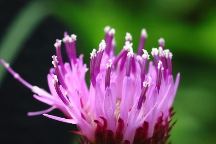 頭花に紅紫色の筒状花が並びます。花冠の先端は5裂し、中央から雄しべ5本の葯が合着した集約雄しべ(葯筒)を出しています。現在は雄性期で、白い花粉が見えています。