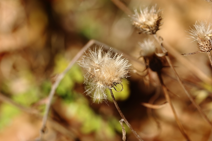 綿毛を付けています。筒状花の基部にある冠毛が羽毛状に発達して痩果に付属し、脱落しやすく風で運ばれます。やや褐色化し、脱落した綿毛がいくつか見えています。