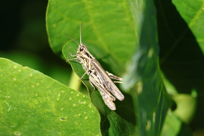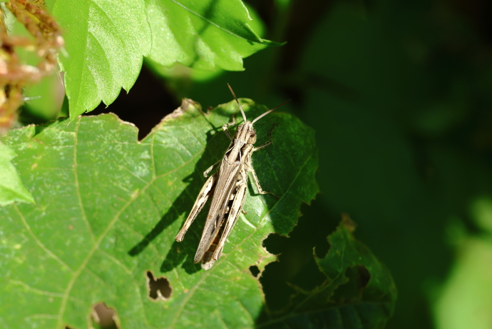 バッタ類の中では、大きなメスでも3cmほどと小さく、名に「雛」を冠しています。開けた草地に生息し、点在するススキやオギなどのイネ科植物の葉を好んで食べます。
