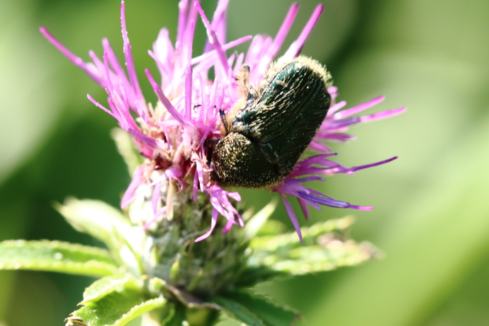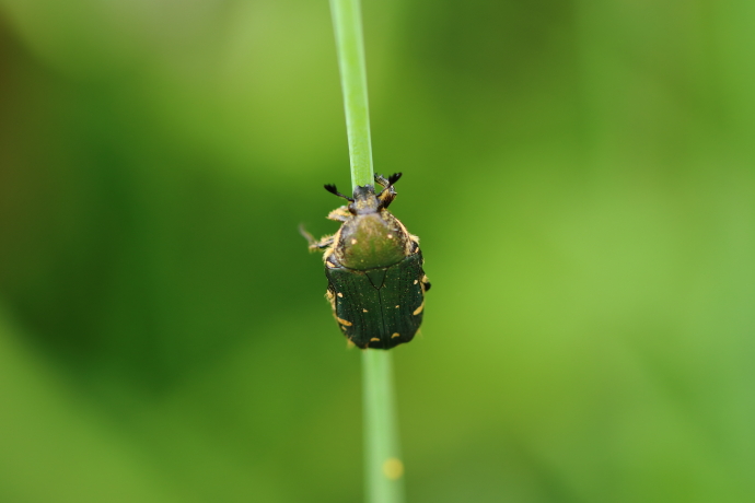 クリの花序の中に隠れていました。銅色を帯びた緑色で光沢があり、上翅に白斑があります。体毛と点刻が目立たないことから、こちらはアオハナムグリと思われます。