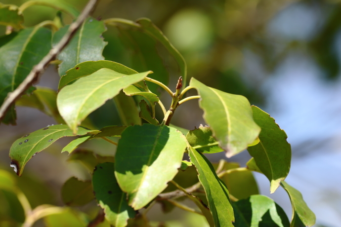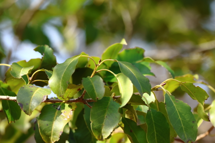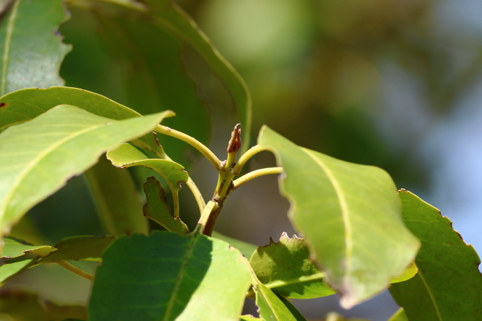 枝先に卵状楕円形の葉が互生し集まっています。葉縁は全縁でやや波打っています。前年に展開した枝は淡緑色で稜があり、枝先や葉腋には暗紅褐色の冬芽がついています。