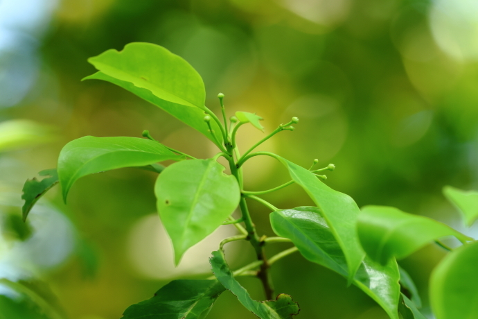 冬芽が芽吹き、新梢が展開してきました。新梢の葉腋にはすでに花序が伸びています。雌雄異株で、こちらは雌株です。花序は散形状に伸び、先端に雌花を咲かせます。