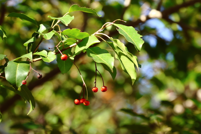 赤い果実が吊り下がっています。果実は球形の核果で、4つの核があり、それぞれに種子が一つ入っています。冬まで残ることが多く、野鳥には寒い時期の貴重な餌になります。