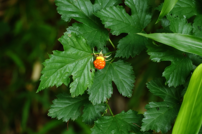 葉は互生し、広卵形で3~7裂に中裂します。裂片の先は尖り、縁には重鋸歯が並びます。モミジイチゴと異なり、茎や葉柄の棘は少なく、葉は深裂せず掌大になります。