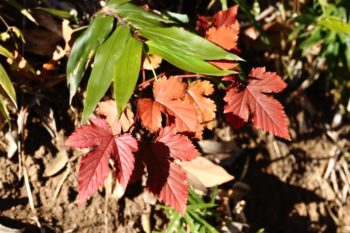 紅葉した葉を見つけました。黄色から赤みの強い橙色まで色豊かで、緑のササ葉と鮮やかな対比を見せています。半常緑性が強く、冬でも紅葉した葉を残す姿をよく見かけます。