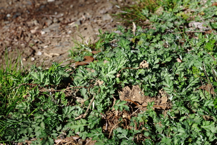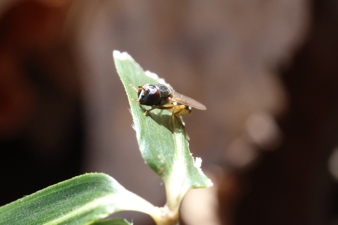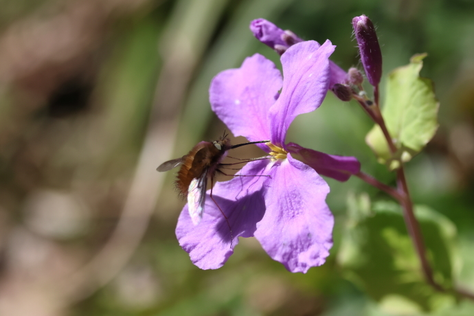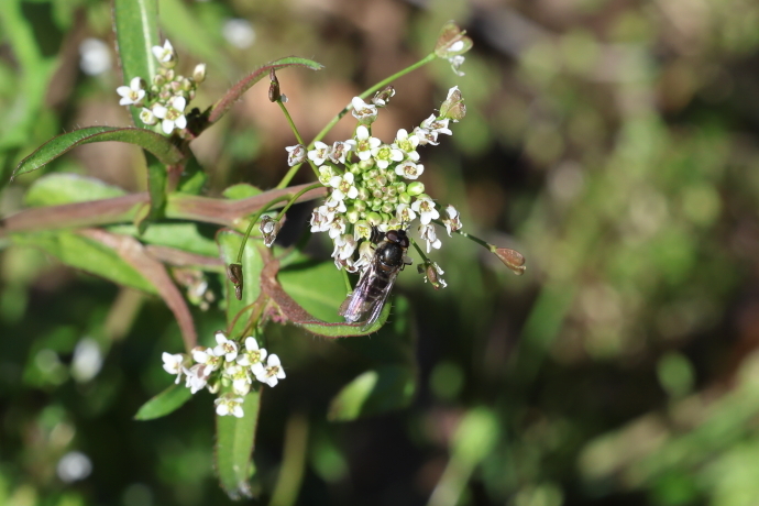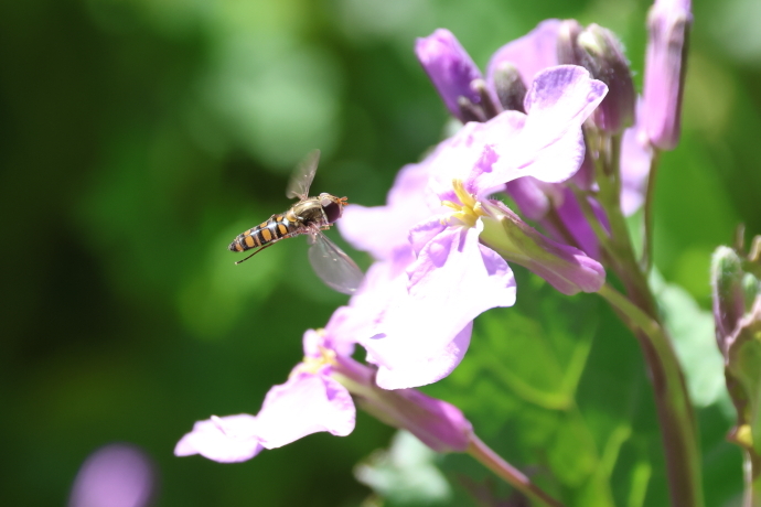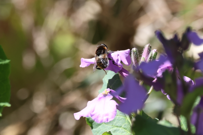 足元ではヨモギやシロツメクサが勢いを増し、ムラサキハナナの群落は一面が淡紫色に染まり、ミツバチやハナアブが羽音を響かせながら飛び交っています。