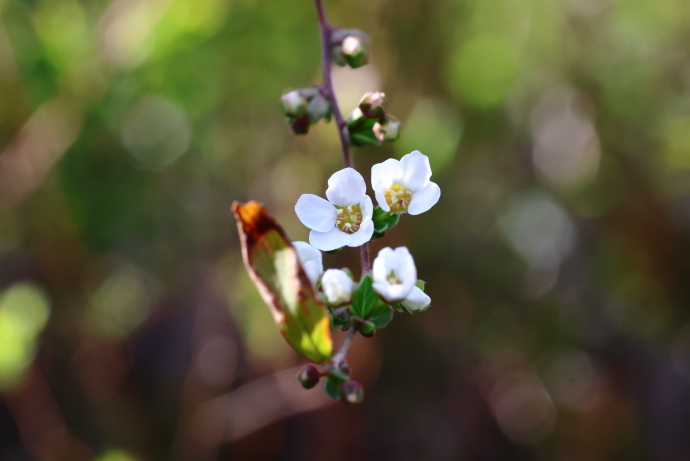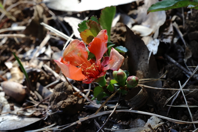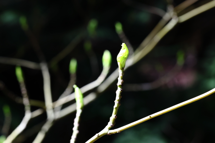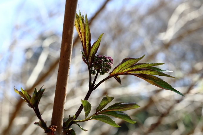 イロハモミジやウツギなど、多くの樹木で冬芽がいっせいに動き始めました。ニワトコは葉の間から早くも花序をのぞかせています。
