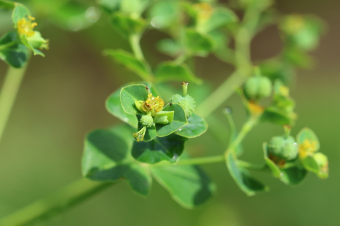 トウダイグサ属・ニシキソウ属の特徴:小型の杯状の総包の内に1つの雌花と周りに数個の雄花がまとまった杯状花序を形成